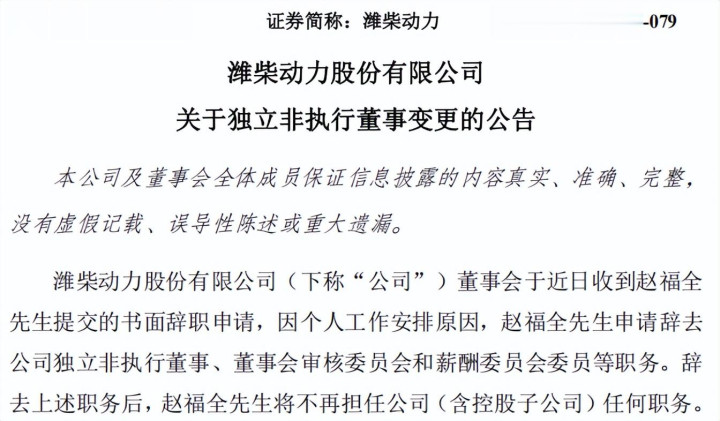 2025年12月20日,潍柴动力股份有限公司发布关于独立非执行董事变更的公告。公告显示,潍柴动力董事会于近日收到赵福全提交的书面辞职申请,因个人工作安排原因,赵福全申请辞去公司独立非执行董事、董事会审核委员会和薪酬委员会委员等职务。辞去上述职务后,赵福全将不再担任公司(含控股子公司)任何职务。