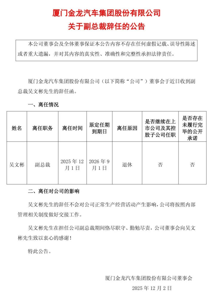 2025年12月1日,厦门金龙汽车集团股份有限公司发布公告,董事会于近日收到副总裁吴文彬的辞任函,离任时间为2025年12月1日,理由是“退休”,而原定任期到期日为2026年9月1日。