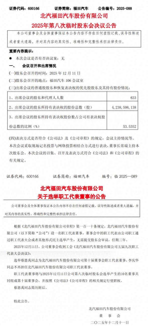 2025年12月12日,北汽福田汽车股份有限公司发布2025年第八次临时股东会决议公告。同日,福田汽车发布选举职工代表董事的公告。职工代表董事将与2025年12月11日公司第八次临时股东会选举产生的10名董事共同组成第十届董事会,并按照《公司法》《公司章程》的相关规定行使职权。具体来看: